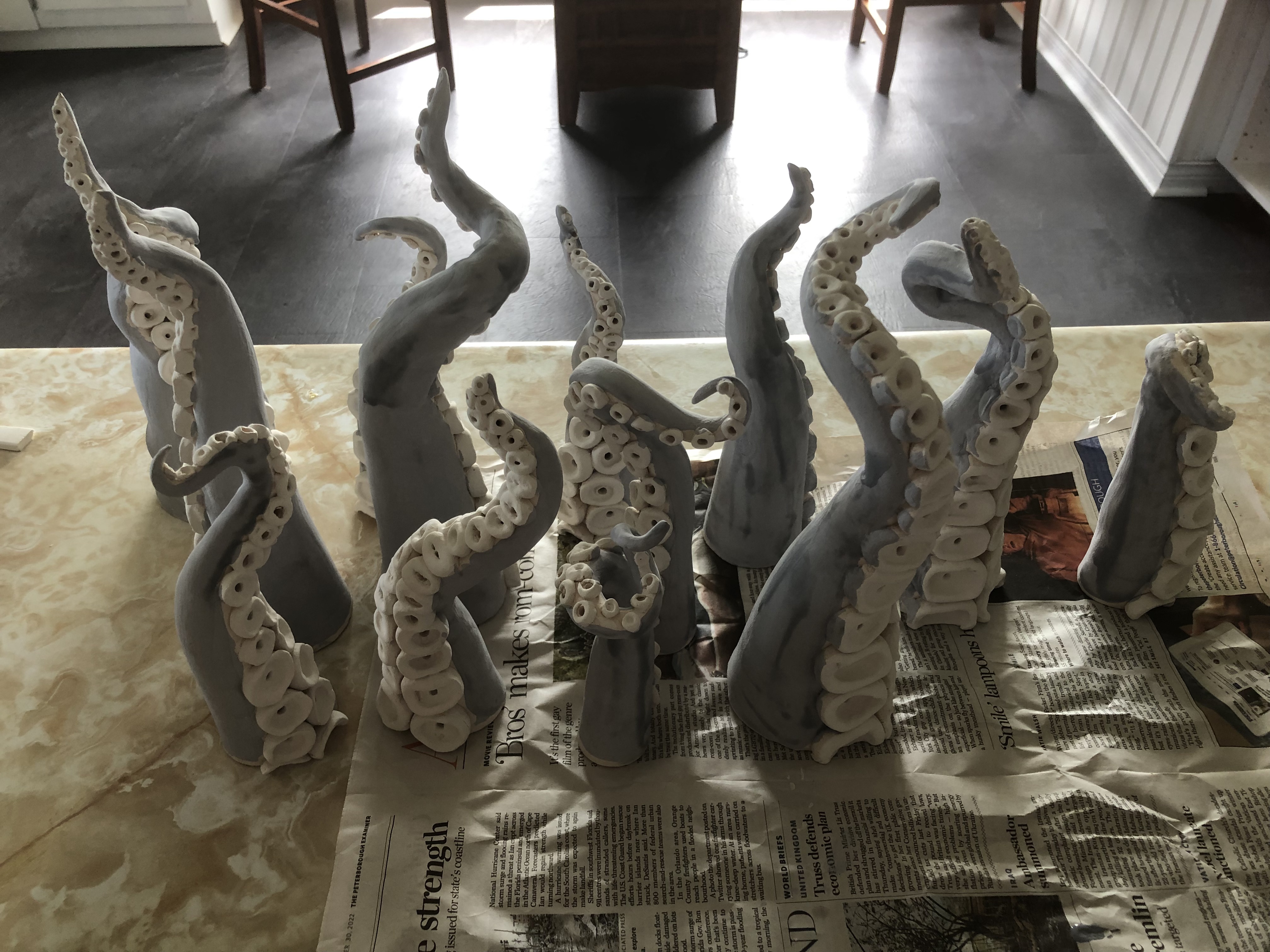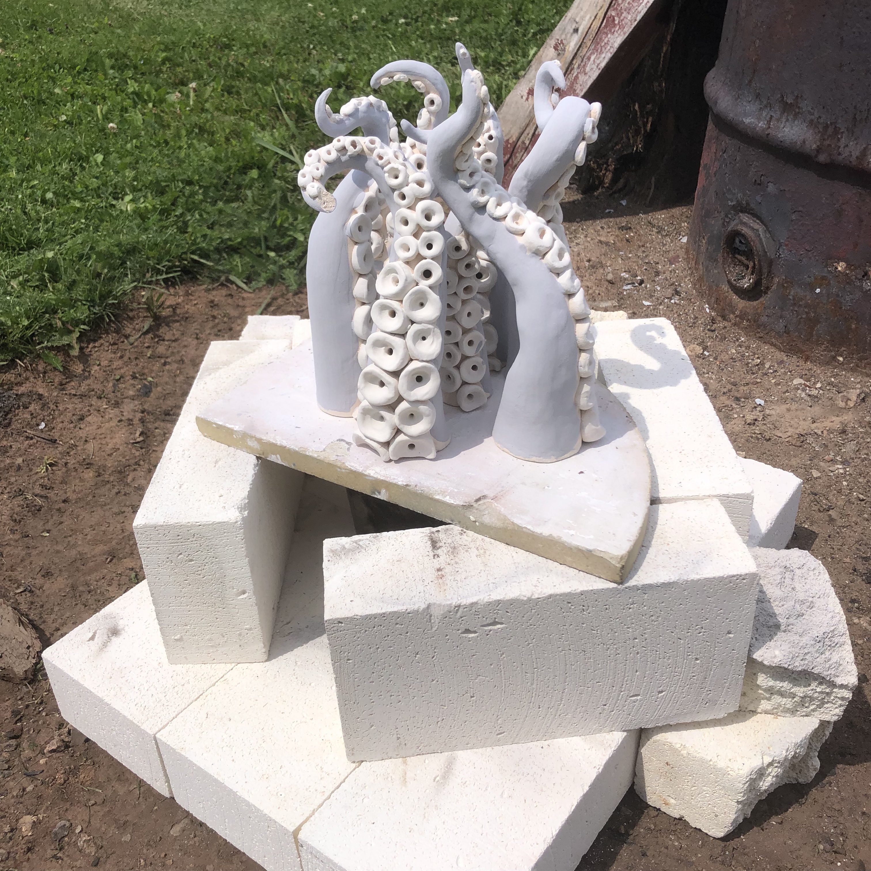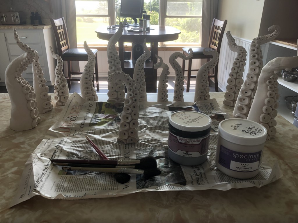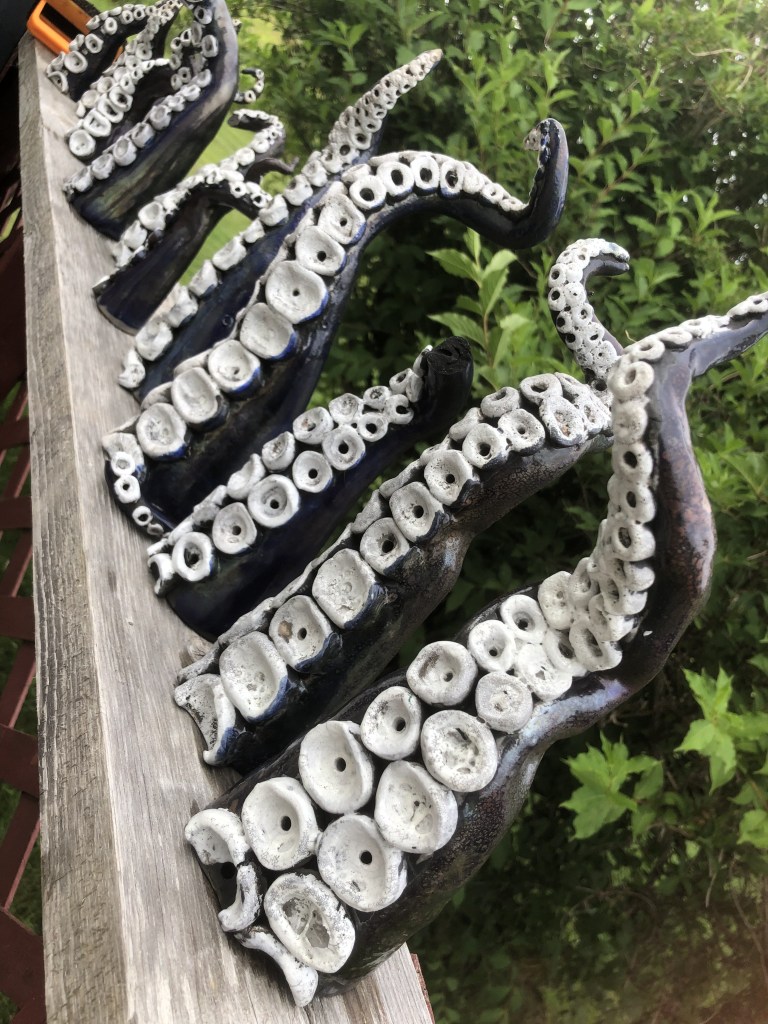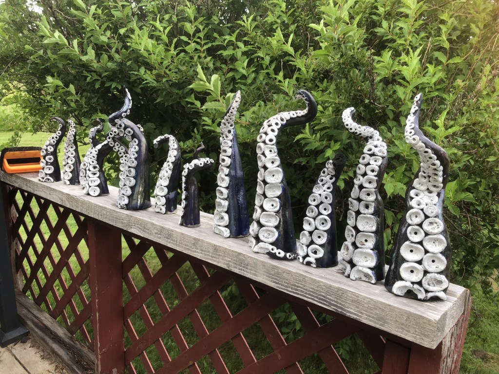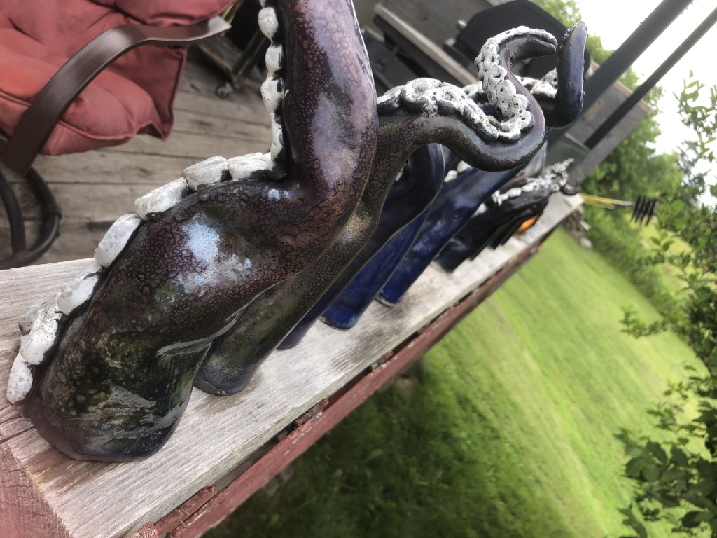 Third time firing up this raku kiln I’ve assembled for PEI. Starting to get some really good results and quick firing times with the addition of fire brick base. Still need to refine my temp control to get a good melt on my glazes before pulling them. Working with two smaller metal popcorn tins and a small garbage can with straw for reduction cans. Getting lots of good carbon trapping. Used Spectrum’s White Crackle and Neptune Raku Glazes. See my Raku Ready post for more info on how i made the tentacles. Tentacles will be displayed in the Fitzroy Street Tiny Art Gallery in August 2024! Stay tuned for more pics for installation (plus a giveaway!).